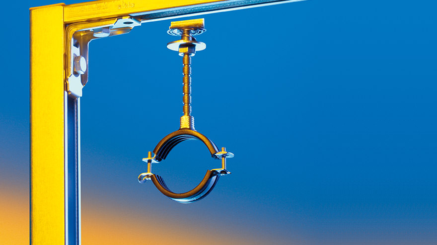 Abrazadera de dos piezas con doble rosca de conexión M8 y M10. Para soportación de todo tipo de tuberías de instalaciones mecánicas. Adecuada para montaje insonorizado en techo, pared y suelo, insonorización según DIN 4109. Abrazadera de cierre rápido que ahorra tiempo de instalación.